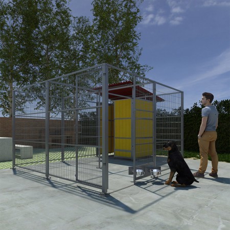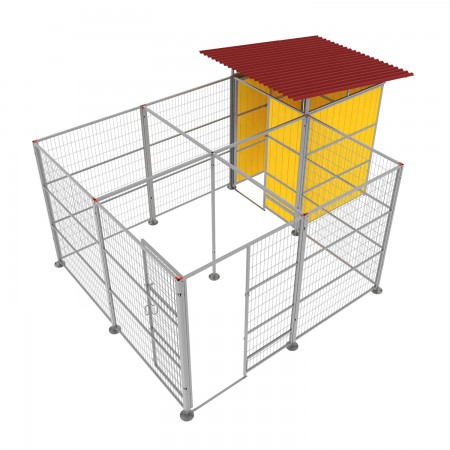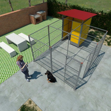 -Box de 4.50 x 3.00 x 1.90 ( 9.00m2) una zona  de patio DE 9.00m2 con todos los laterales de reja y otra con laterales PVC  de 2.25m2  para protegerse de las inclemencias del tiempo.Se entrega con un tejado "T-1", ideal para tapar la zona de dormitorio. És un modelo que podemos tener más de un animal  cerrado, ya que dispone de un amplio patio, o libres por el jardín con la puerta  abierta que les sirva de refugio mientras disfrutan  (existen diferentes combinaciones).