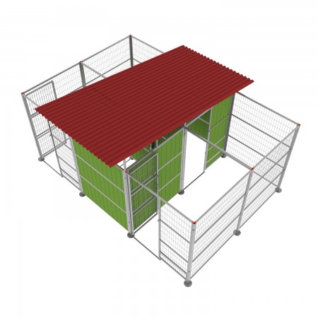 -Modelo de 2 departamentos de 4.50 x 3.00 x 1.90 (13.50m2) en total, este modelo consta de dos departamentos totalmente separados entre ellos, cada uno consta de patio 4.50m2 y zona de refugio 2.25m2. Se entrega con un tejado "T-1" y "T-2". Modelo para separar los dos animales completamente, tanto si los tenemos cerrados y cada uno tiene su comida y cama o si están libres por el jardín (diferentes formas en "Combinaciones").