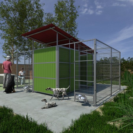 -Box modelo"BOGOTA"de 2 departamentos totalmente separados con un total  de 4.50 x 3.00 x1.90 (13.50 m2) con paneles reja y paneles PVC, modular, con sistema de fijación "KLASK" sin tornillos. Ideal para  jardines y chalets,  cada departamento tiene su patio y refugio completamente  cerrado para proteger a la mascota del mal tiempo.Todos los paneles se fijaran mediante unos pilares  con pletina y graduables en altura para subsanar las pendientes del terreno .Este tipo de modulo nos permite, o cerrar dos animales por separado , o dejar los departamentos abiertos y que cada uno tenga su comida y zona de descanso.Entregamos el modelo con un conjunto tejado  T-1, y  el tejado T-2, para tener los dos zonas de descanso cubiertas, también se puede pedir como accesorio más tejado , para cubrir una parte de patio.Fabricado con perfiles de hierro galvanizado y lamas de PVC, todo anticorrosivo. El box consta de seis laterales reja y un frontal reja en la zona de patio y un frontal PVC y cinco laterales PVC en la zona de descanso, también se entregan 2+2 marquesinas con correas y placas techo ECOLINE que aíslan y protegen de la lluvia y son fáciles de montar y desmontar. Las puertas de los frontales tienen un sistema de doble cierre y la opción de cierre con llave, existen diferentes accesorios para los box. (consultar accesorios).