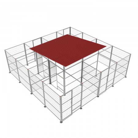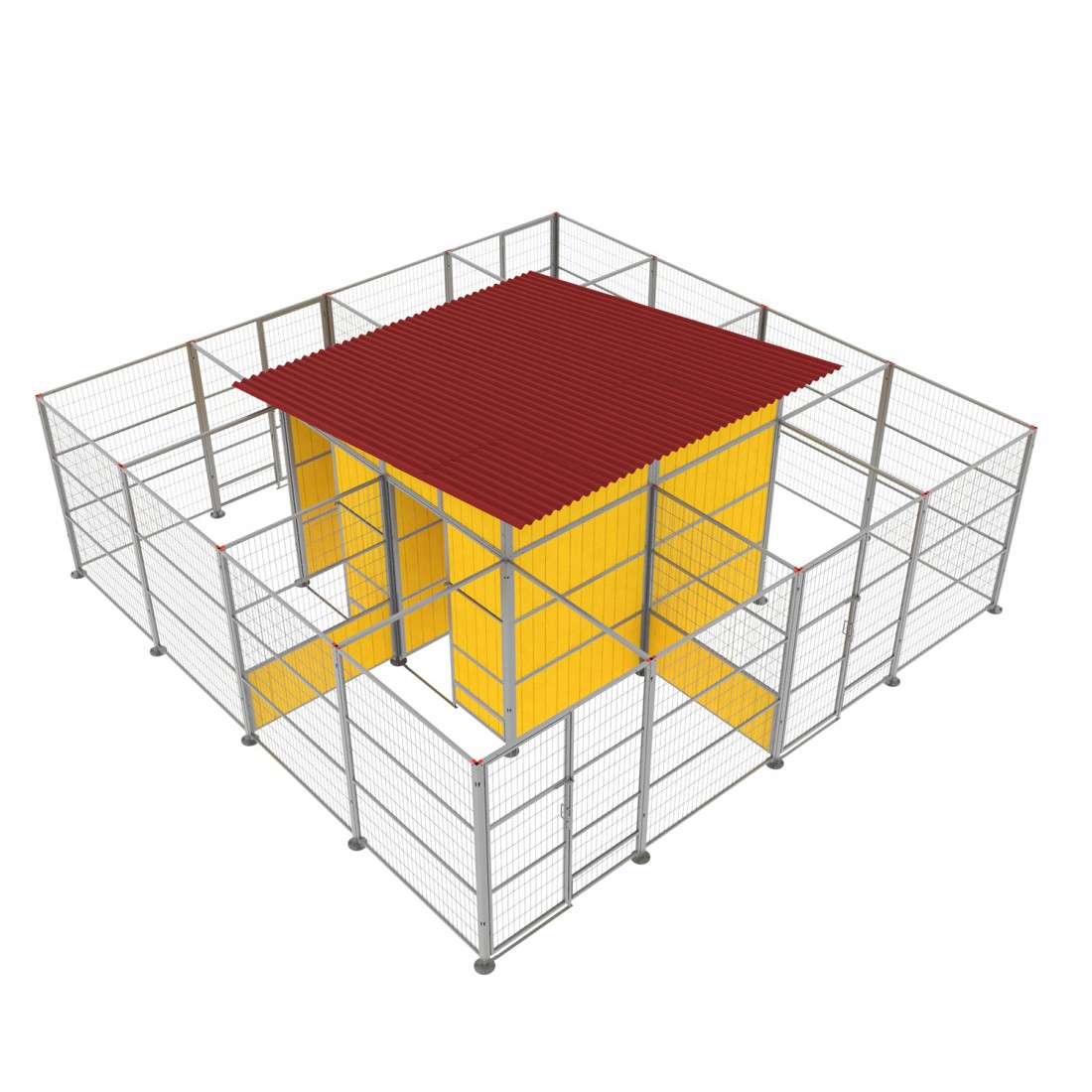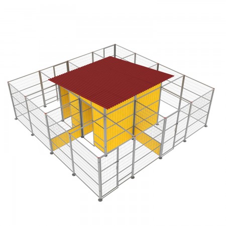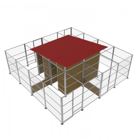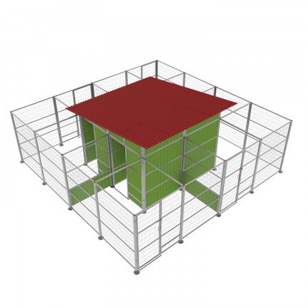 Modelo de 4 departamentos en forma de isla de  6x6 x1.90 (36.00m2) total, departamentos totalmente independientes, cada uno con patio muy amplio de 6.75m2 y zona de refugio 2.25m2. Este es un modelo en que los patios quedan a todo alrededor y las zonas de descanso en el centro, ideal para residencias, criadores, adiestradores... Laterales mixtos (PVC+reja) entre los patios. Se entrega con dos tejados "T-1" y  "T-2". En el chalet, tenemos un espacio claro, amplio... diferente a los otros modelos.