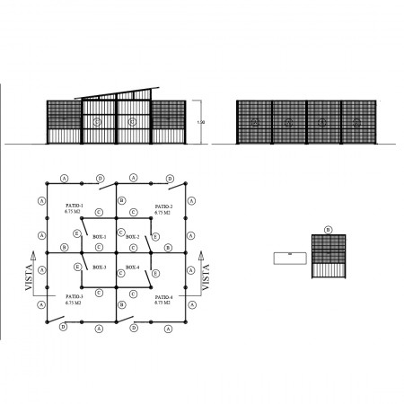-Modelo con 4 departamento para perros. Cada departamento Independiente y con su patio de 6.75m2, teniendo todos una zona de descanso cerrada y tapada de 1.50x1.50.