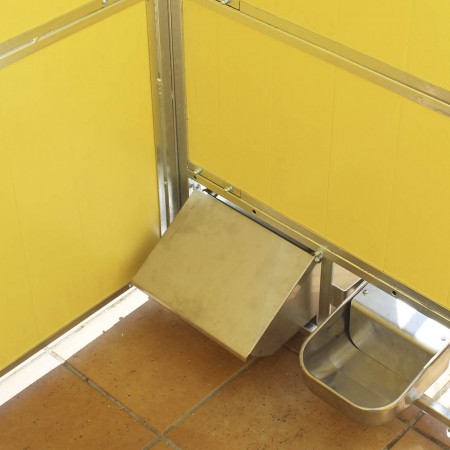 -Accesorio de TOLVA ALIMENTACION INOXIDABLE en la que podemos almacenar pienso para nuestra mascota , pudiendo regular la cantidad de caida.Ideal para que nuestras mascotas tengan siempre comida .Esta tolva de acero inoxidable esta preparada para fijar en los FRONTALES BOX KLASKDOG , teniendo unos anclajes que se adapta perfectamente .La tolva tiene unas medidas de 66 x 21 x 35 cms y cabida de unos 15kg aprox,con tapa superior y tapa semi-cerrada( con lo cual el animal puede abrir la tapa para comer , pero resguardamos de que la comida pueda mojarse o las aves puedan extraer el pienso ) en la parte de la comida, quedando totalmente estanco de la lluvia,tambien tenemos una rasera para graduar la cantidad de comida, de muy facil graduacion.El llenado de la tolva és des del exterior del box .La tolva se aconseja para instalaciones fijas y normalmente viene acompañada de la adquisicion del BEBEDERO INOX, que tambien tenemos en accesorios.