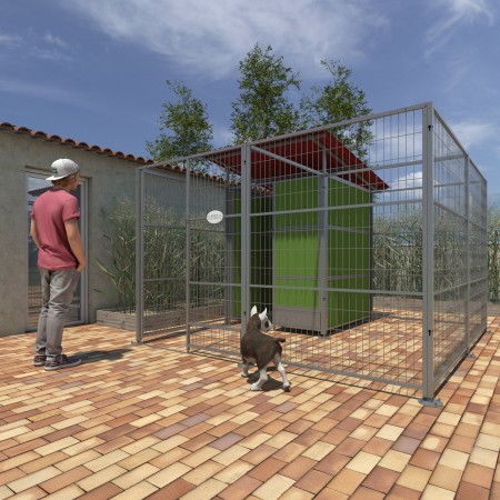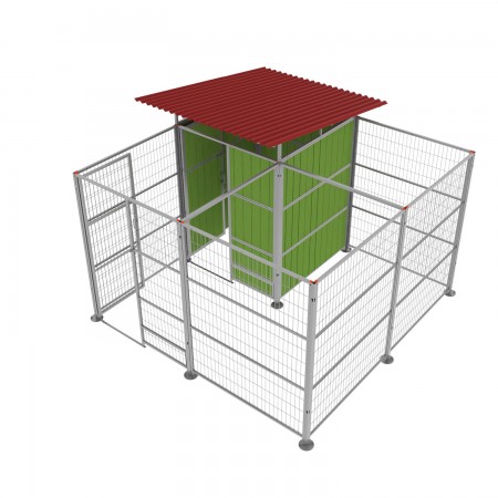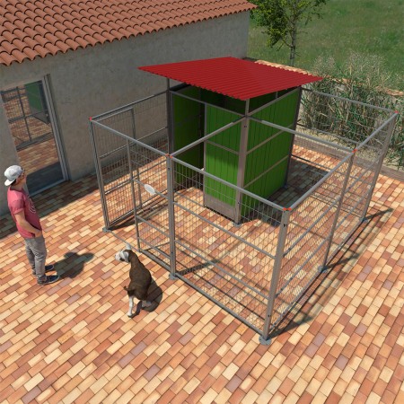 -Box de 3.00 x 3.00 x 1.90 ( 9.00m2) 1 departamento, tenemos dos zonas, una de patio de 6.75m2 con todos los laterales de reja y otra con laterales PVC para protegerse de las inclemencias del tiempo. Se entrega con un tejado "T-1", ideal para tapar la zona de dormitorio. És un modelo que podemos tener más de un animal  cerrado, ya que dispone de un amplio patio, o libres por el jardín con la puerta  abierta que les sirva de refugio mientras disfrutan del jardín (existen varias combinaciones).