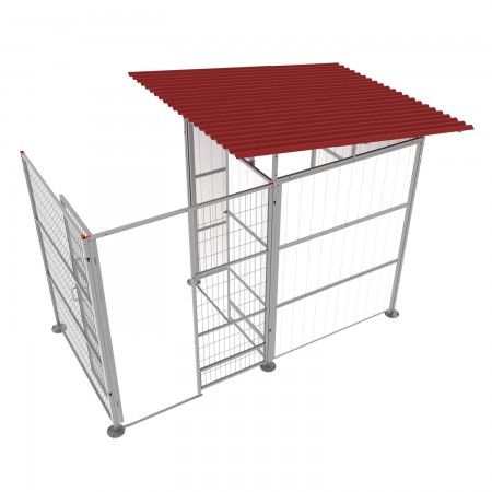 Box de 1.50 x 3.00 x 1.90 (4.5m2) con dos zonas bien diferenciadas una patio en la que todos los paneles serán reja y otra de PVC, como zona de descanso y para resguardo del perro.Aprovechamos la pared ya existente como lateral, con los "KIT PARED " para fijarlo, y con el modulo, ya viene un tejado "T-1 ", para tapar la zona de descanso (opcional tejado "T-2"). Un modulo que puede servirnos si queremos cerrar los perros o como zona de refugio.