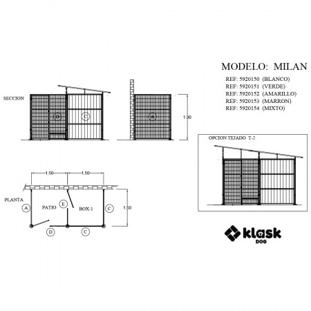 -Box modelo "MILAN" de 1.50 x 3.00 (4.5 m2)con paneles reja y paneles PVC, aprovechando una pared de nuestra casa como dos laterales... modular, con sistema de fijación "KLASK" sin tornillos.Este modelo es ideal para terrazas o jardines , en el que tenemos dos departamentos bien diferenciados , un de Patio todo reja, y otro con laterales PVC cerrado para proteger a la mascota del mal tiempo. En este modelo aprovechamos la pared de la casa para ahorrarnos dos laterales y poder tener un box más amplio.Este tipo de box al tener las dos zonas diferenciadas , el animal si lo tenemos que cerrar en algún momento, dispone de más espacio para moverse y sino es ideal opara tener la puerta abierta y nuestro perro pueda andar libremente por el jardín, y refugiarse si es para descansar o para la comida.Este modelo se entrega con KIT PARED, que consta de los pilares para fijarlos en la pared del edificio con tacos, también se suministra el tejado "T-1", de un departamento y tenemos la opción de pedir el segundo tejado "T-2", para poder tener más zona de sombra o refugio para el agua. Fabricado con perfiles de hierro galvanizado y lamas de PVC, todo anticorrosivo.el box consta de un lateral reja y un frontal reja en la zona de patio, y dos laterales PVC y un frontal puerta PVC en la zona de descanso, también se entregan 2 marquesinas con correas y placas techo de ECOLINE que aíslan y protegen de la lluvia y son fáciles de montar y desmontar. Las puertas de los frontales tienen un sistema de doble cierre y la opción de cierre con llave (consultar accesorios). También tenemos diferentes accesorios para la comida y el agua adaptables a cualquier frontal( consultar accesorios).
