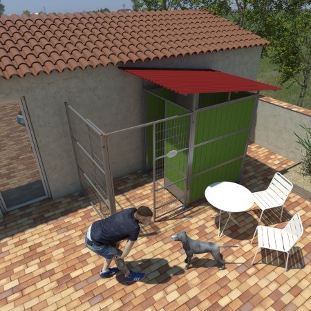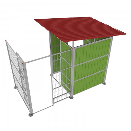 Box de 1.50 x 3.00 x 1.90 (4.5m2) con dos zonas bien diferenciadas una patio en la que todos los paneles serán reja y otra de PVC, como zona de descanso y para resguardo del perro.Aprovechamos la pared ya existente como lateral, con los "KIT PARED " para fijarlo, y con el modulo, ya viene un tejado "T-1 ", para tapar la zona de descanso (opcional tejado "T-2"). Un modulo que puede servirnos si queremos cerrar los perros o como zona de refugio.
