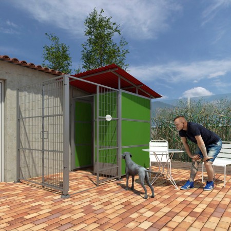 -Modelo de box para jardín o terraza, pudiendo dejar la puerta abierta para que el perro disfrute más libremente por nuestro patio, con la ventaja que en algún momento podemos cerrar al animal, teniendo bastante espacio entre las dos zonas diferenciadas.