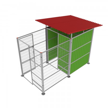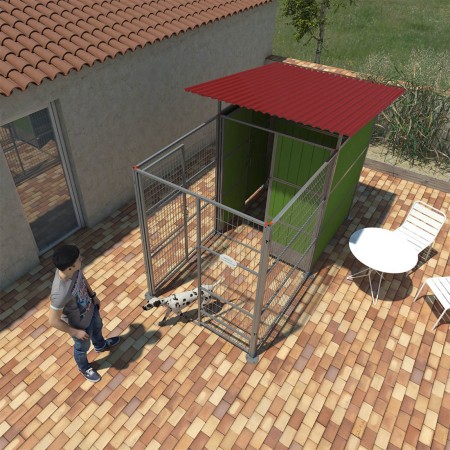 Box de 1.50 x 3.00 x 1.90 (4.5m2) con dos zonas bien diferenciadas una patio en la que todos los paneles serán reja y otra de PVC , como zona de descanso y para resguardo del perro ,ya viene un tejado" T-1 ", con placas ECOLINE  preparadas para tapar la zona de descanso ( opcional tejado   "T-2").Un módulo mediano  puede servirnos si queremos cerrar nuestra mascota o como zona de refugio o si por el contrario el animal disfruta libremente de nuestro jardín.