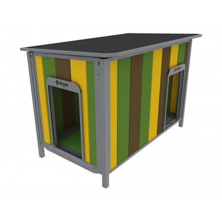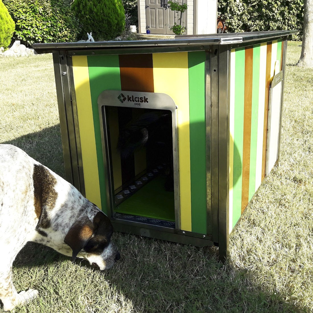 Caseta KLASKDOG para perros totalmente desmontable y fabricada con materiales de alta calidad.Ideal para que nuestro perro se encuentre en las mejores condiciones para su descanso, debemos mirar el perro que tenemos que se adapte mejor a las medidas de las casetas ;en interior dispone de un suelo de goma ,caucho totalmente resistente y a la vez es aislante .Disponen tel tejado en forma de tapa superior y basculante para poder accceder al interior, la tapa por la parte superior tambien llevara la misma goma para que el animal pueda descansar en cima de la caseta.La caseta lleva dos puertas (una puede cerrarse)porque muchos perros para entrar en un sitio cerrado , necesitan que tengan un lugar de escape.Esta fabricada en acero inoxidable,aluminio,PVC(5 colores a escoger)..materiales todos ellos de maxima calidad i anti-corrosivos.La caseta estar levantada con 4 patas y llevara unos tacos de goma con ruedas giratorias como accesorio entre otros.