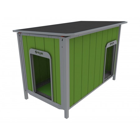 Caseta KLASKDOG para perros totalmente desmontable y fabricada con materiales de alta calidad.Ideal para que nuestro perro se encuentre en las mejores condiciones para su descanso, debemos mirar el perro que tenemos que se adapte mejor a las medidas de las casetas ;en interior dispone de un suelo de goma ,caucho totalmente resistente y a la vez es aislante .Disponen tel tejado en forma de tapa superior y basculante para poder accceder al interior, la tapa por la parte superior tambien llevara la misma goma para que el animal pueda descansar en cima de la caseta.La caseta lleva dos puertas (una puede cerrarse)porque muchos perros para entrar en un sitio cerrado , necesitan que tengan un lugar de escape.Esta fabricada en acero inoxidable,aluminio,PVC(5 colores a escoger)..materiales todos ellos de maxima calidad i anti-corrosivos.La caseta estar levantada con 4 patas y llevara unos tacos de goma con ruedas giratorias como accesorio entre otros.