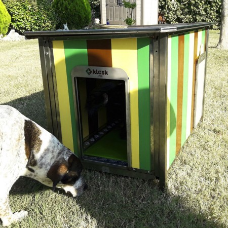 Caseta KLASKDOG  para perros totalmente desmontable y fabricada con materiales de alta calidad.Ideal para que nuestro perro se encuentre en las mejores condiciones para su descanso, debemos  mirar el perro que tenemos que se adapte mejor a las medidas de las casetas ;en interior dispone de un suelo de goma ,caucho totalmente resistente y a la vez es aislante .Disponen tel tejado en forma de tapa superior y basculante para poder accceder al interior, la tapa por la parte superior tambien llevara la misma goma para que el animal pueda descansar en cima de la caseta.La caseta lleva dos puertas (una puede cerrarse)porque muchos perros para entrar en un sitio cerrado , necesitan que tengan un lugar de escape.Esta fabricada en acero inoxidable,aluminio,PVC(5 colores a escoger)..materiales todos ellos de maxima calidad i anti-corrosivos.La caseta estar levantada con 4 patas y llevara unos tacos de goma con ruedas giratorias como accesorio entre otros.