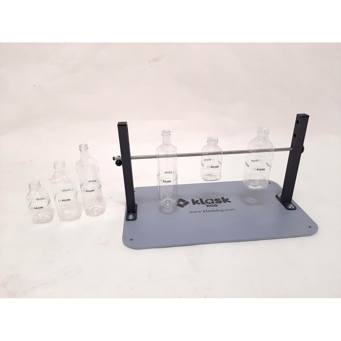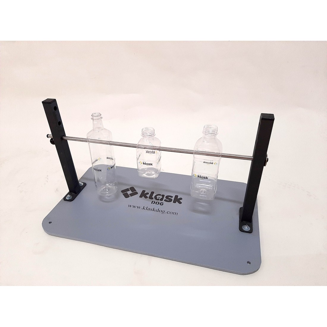 Soporte desmontable con base de plástico, tolalmete lavable, con pilares de hierro pintado con tres posiciones y barra de acero inoxidable. Entregamos 2 botellas de las tres medidas (total 6 botellas). Juego interactivo para nuestra mascota, mientras se entretiene jugando, aprende a resolver para su premio, un juego que canalizará la ansiedad del animal y agilizará su mente.Un animal no necesita sólo actividad física, tenemos que acompañar con actividad mental. Los juegos interactivos, són para que el animal practique su destreza, estando nosotros con él, esto reforzará enormemente nuestros vínculos. El juego consiste en dipositar granos de pienso o golosinas en el interior de las botellas (podemos poner 1-2-3 en el soporte) de diferentes medidas, el animal por la vista y olfato sabe que hay el premio, y mira de girar la botella hasta conseguir el premio, con lo que se entretiene porque un giro rápido, no caerá la comida.....debemos ayudarlo a conseguirlo, pero debe ser él que lo consiga, hay que tener paciencia... cuando lo consiga, le será más fácil la próxima vez, ( botellas pequeñas más facil caida/botellas grandes más dificultad de la caída). ¡Una perfecta forma de agilizar la mente de nuestra mascota!